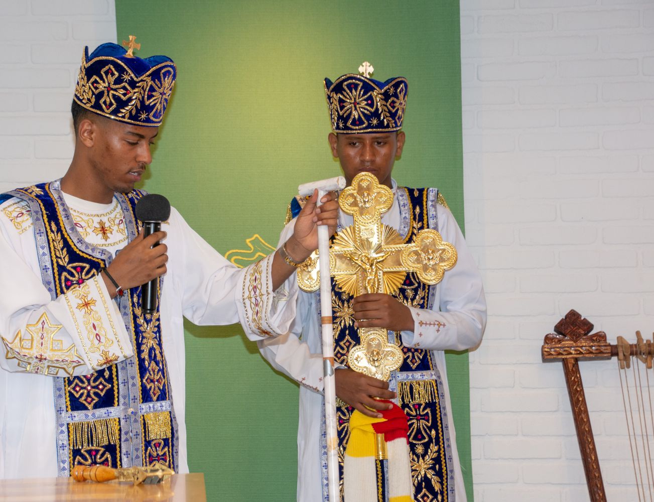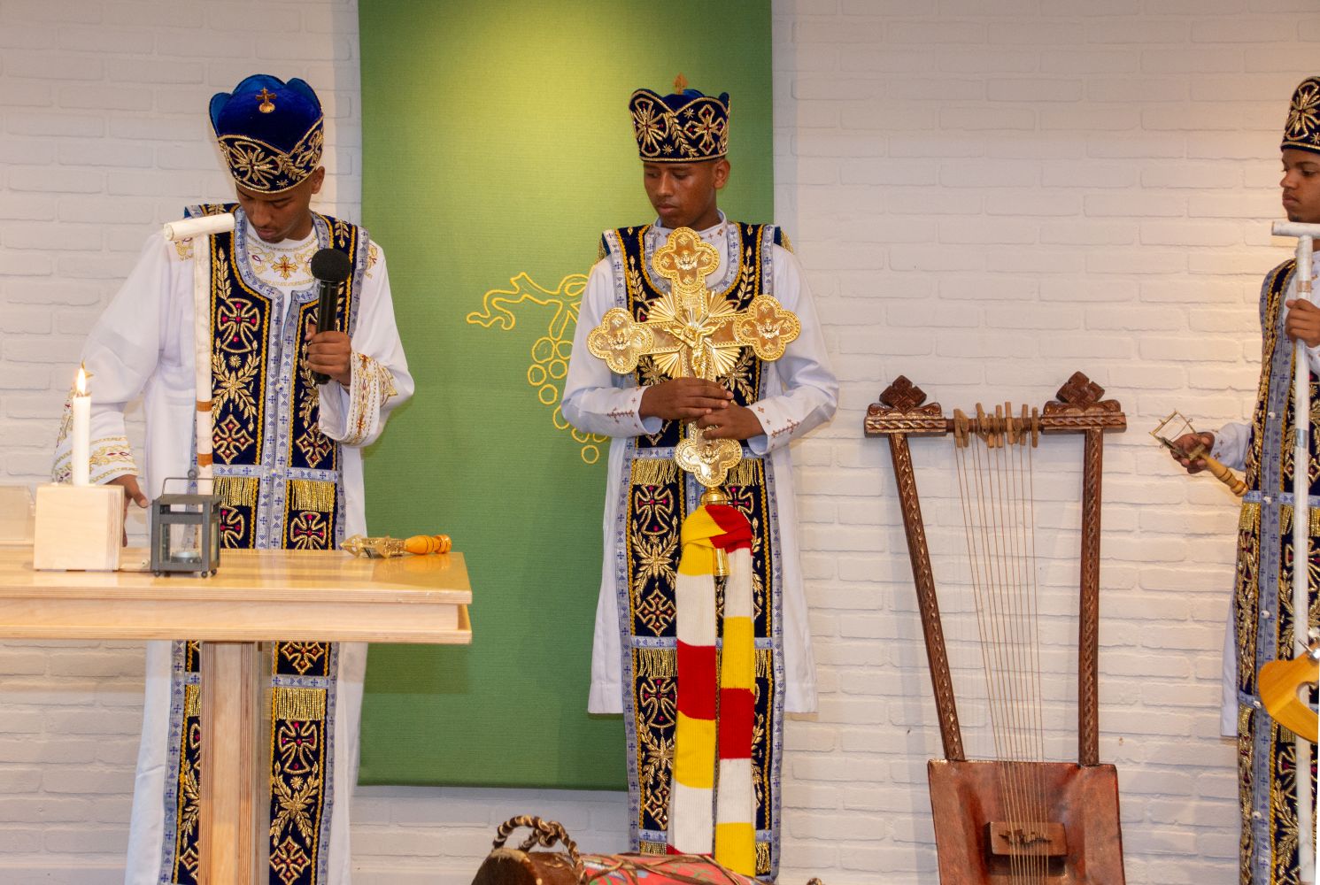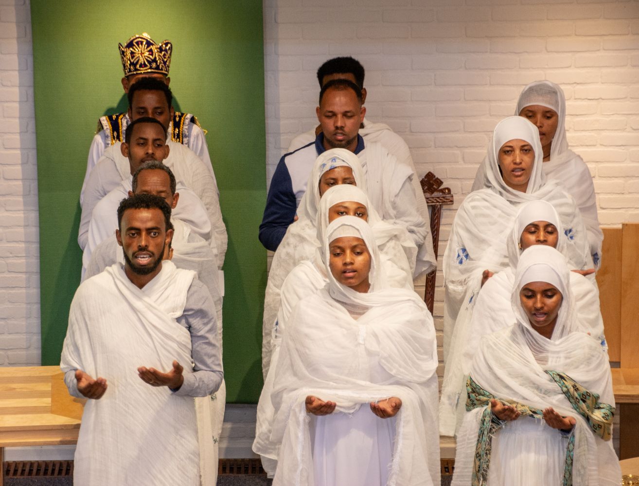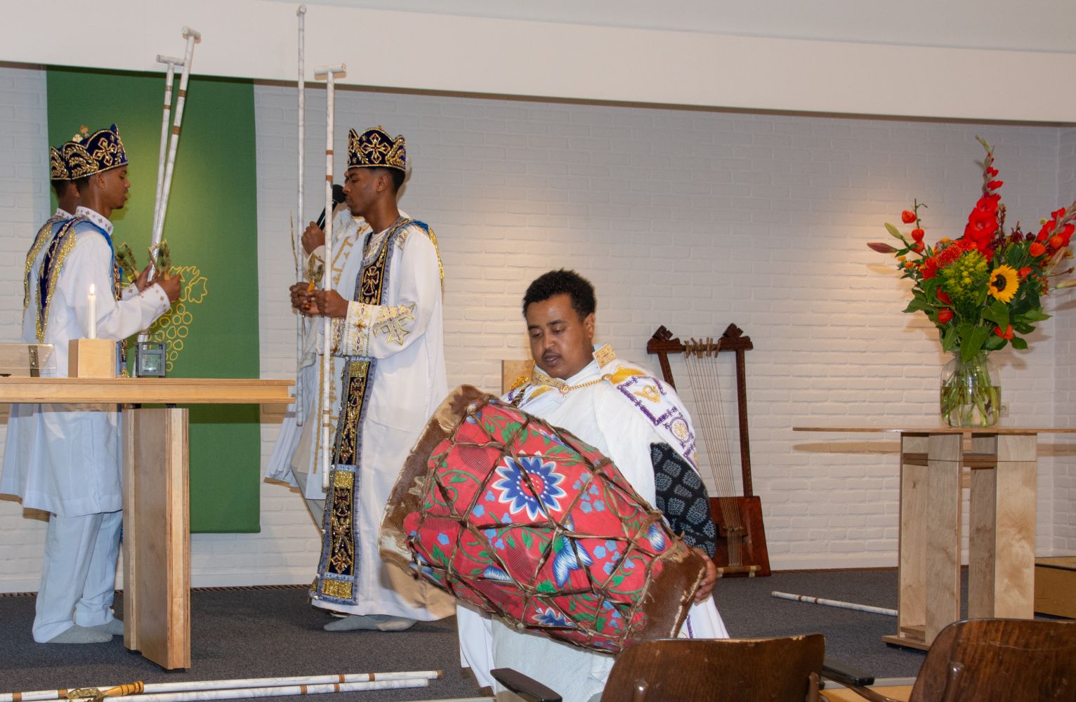 Op zaterdag wordt de kerkzaal van de Kapel verhuurd aan de Eritrese kerk en vanmorgen waren er een aantal leden van die kerk aanwezig. Zij gaven ons een prachtige impressie van hun vieringen en gaven ook een toelichting op de geschiedenis en op het belijden van het geloof bij hun kerkgemeenschap. Het is allemaal heel anders zijn dan wat wij in de Kapel (en de Protestantse kerk) gewend zijn, maar de overeenkomsten zijn er natuurlijk ook.