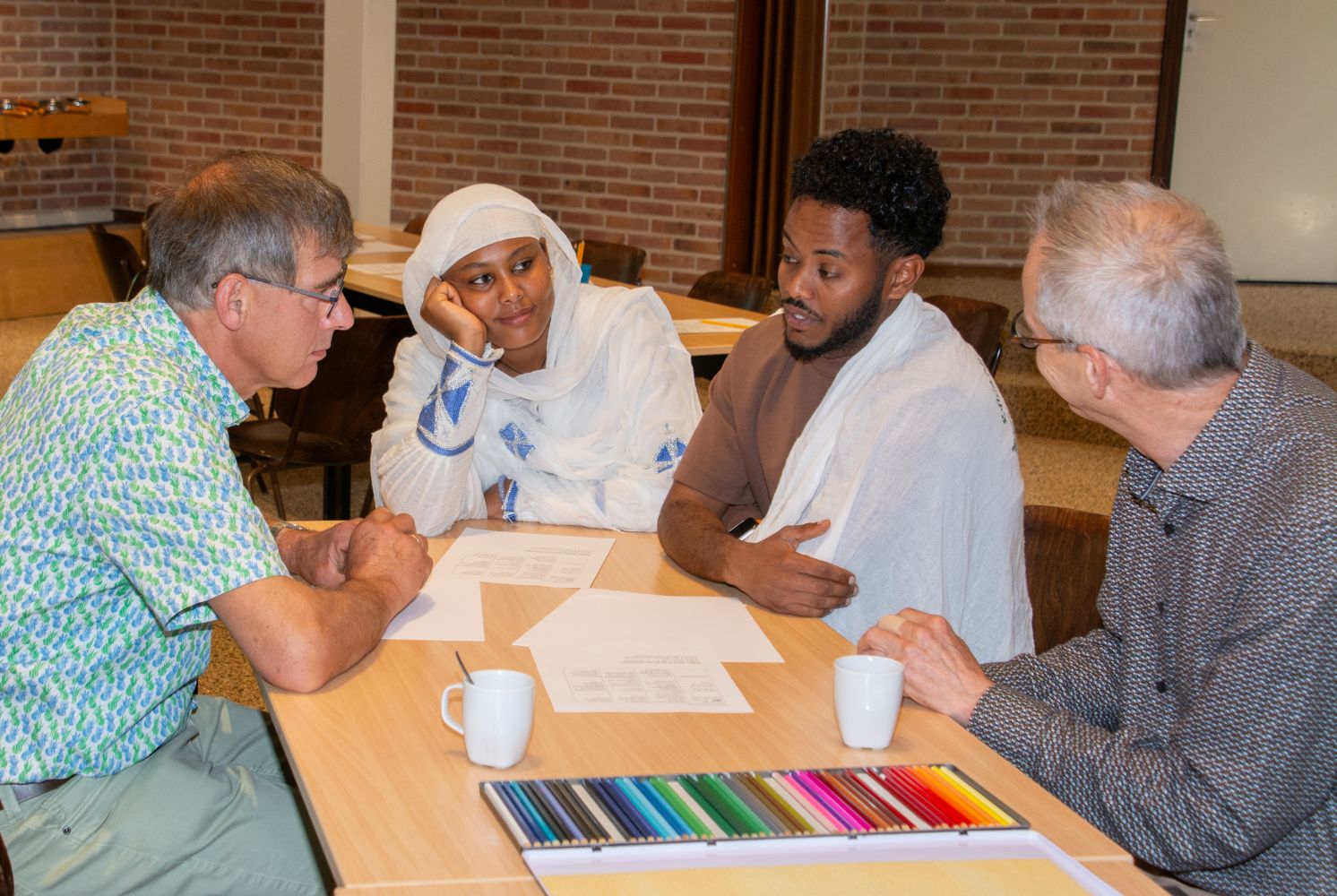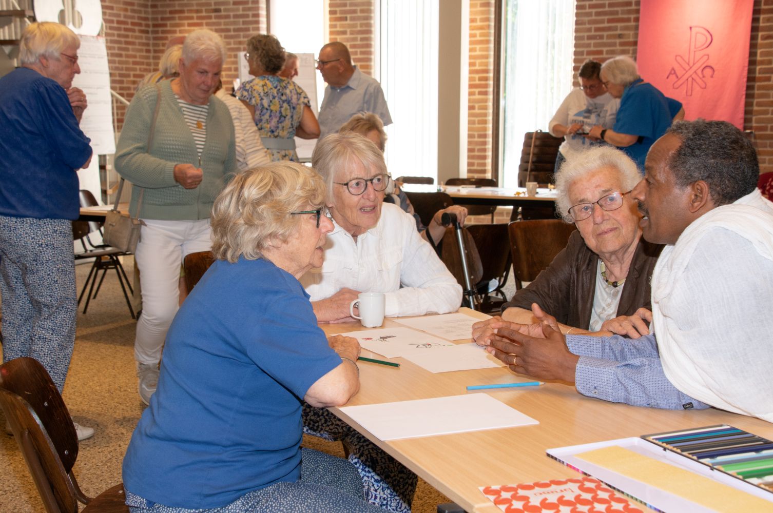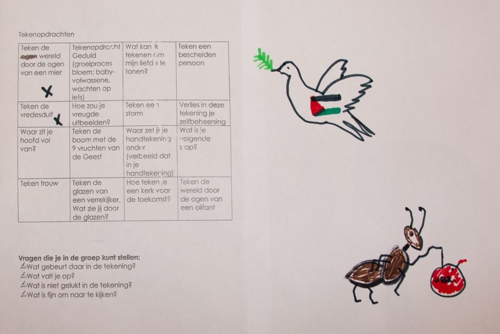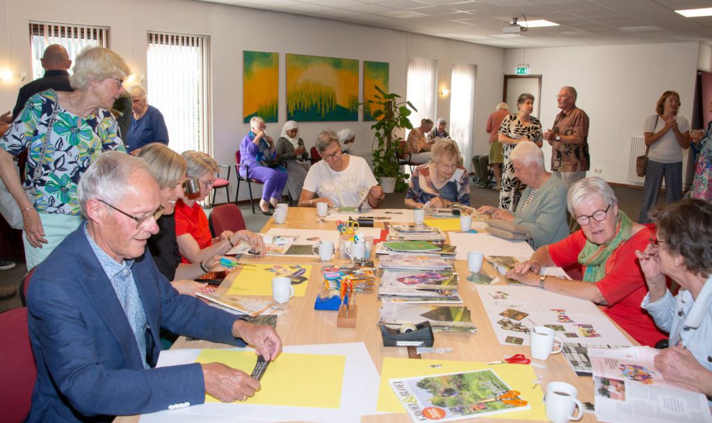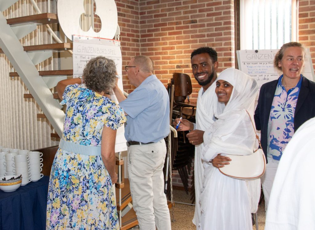 Na de bijdrage door de Eritrese gasten en het samen zingen van een lied werden de aanwezigen verdeeld in vier groepen. Iedere groep ging buiten de kerkzaal aan de slag met een thema/opdracht: foto’s maken, een ganzenbordspel, tekenen en een collage maken. Ondertussen werd er ook voor koffie en thee gezorgd.
