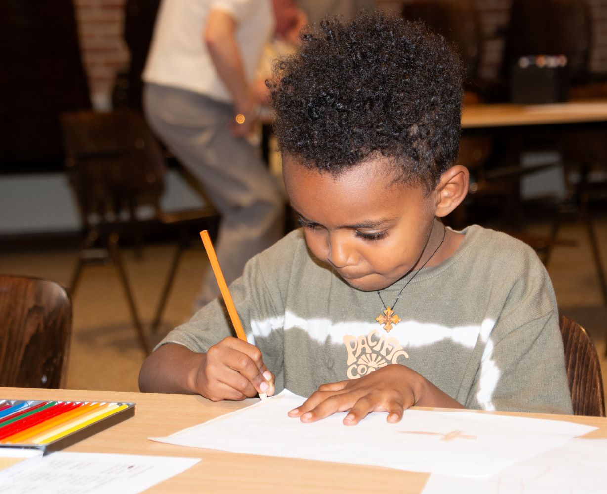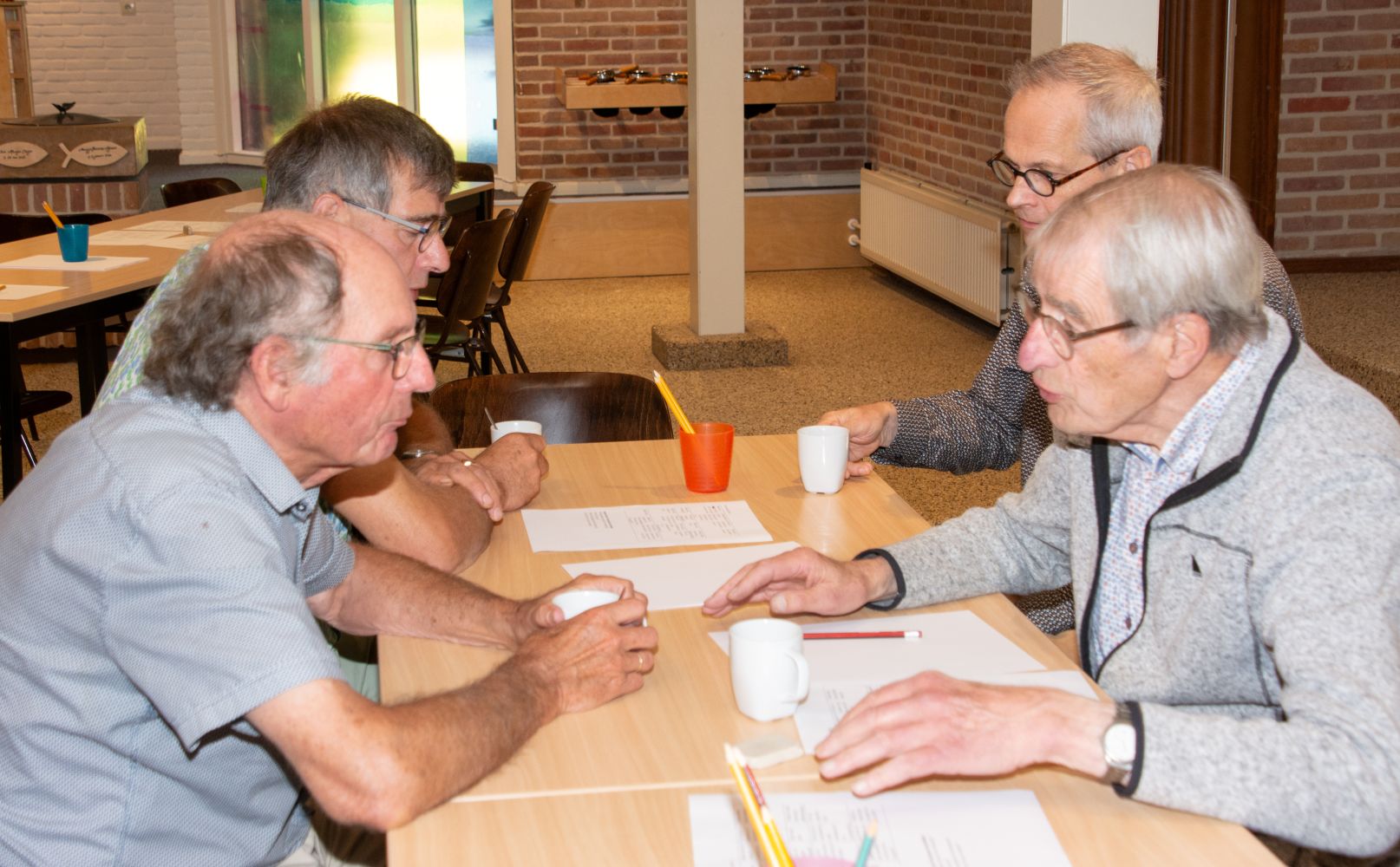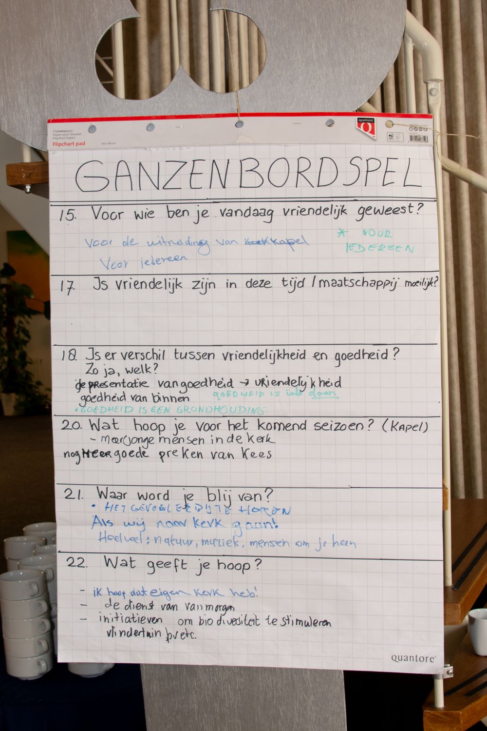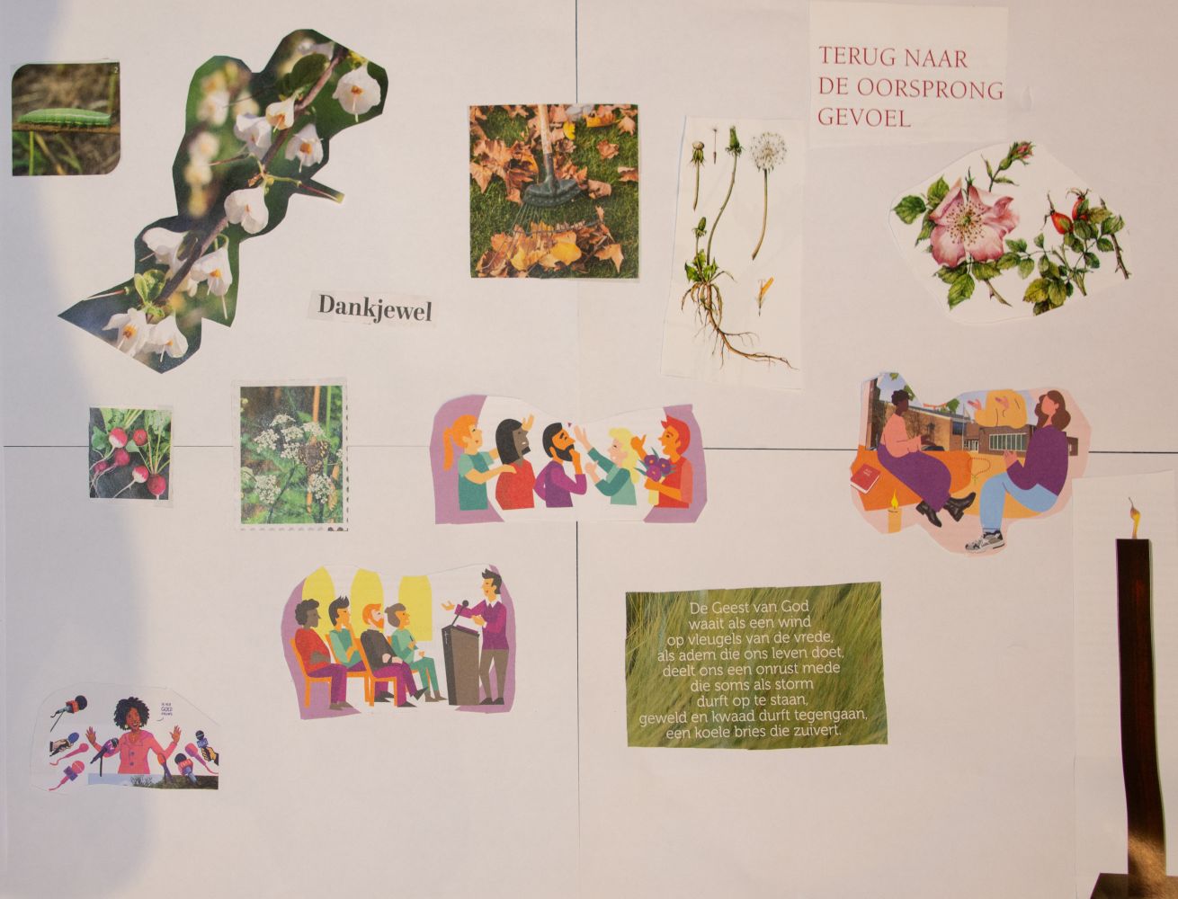 Na de bijdrage door de Eritrese gasten en het samen zingen van een lied werden de aanwezigen verdeeld in vier groepen. Iedere groep ging buiten de kerkzaal aan de slag met een thema/opdracht: foto’s maken, een ganzenbordspel, tekenen en een collage maken. Ondertussen werd er ook voor koffie en thee gezorgd.
