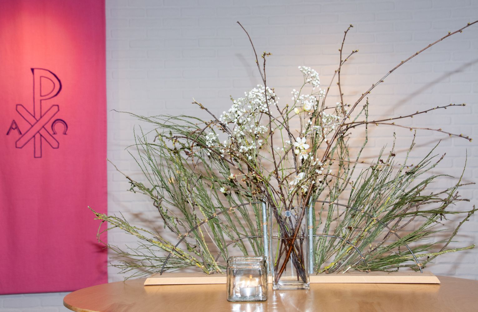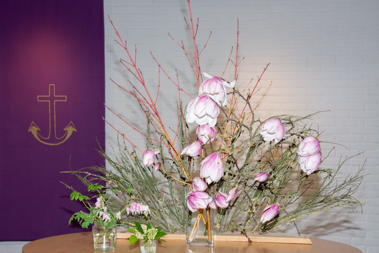 Het zichtbaar maken van het werk van God kan met wit bloeiende bloesemtakken die in de grote vaas worden geplaatst en die verbinding maken met de waaier.