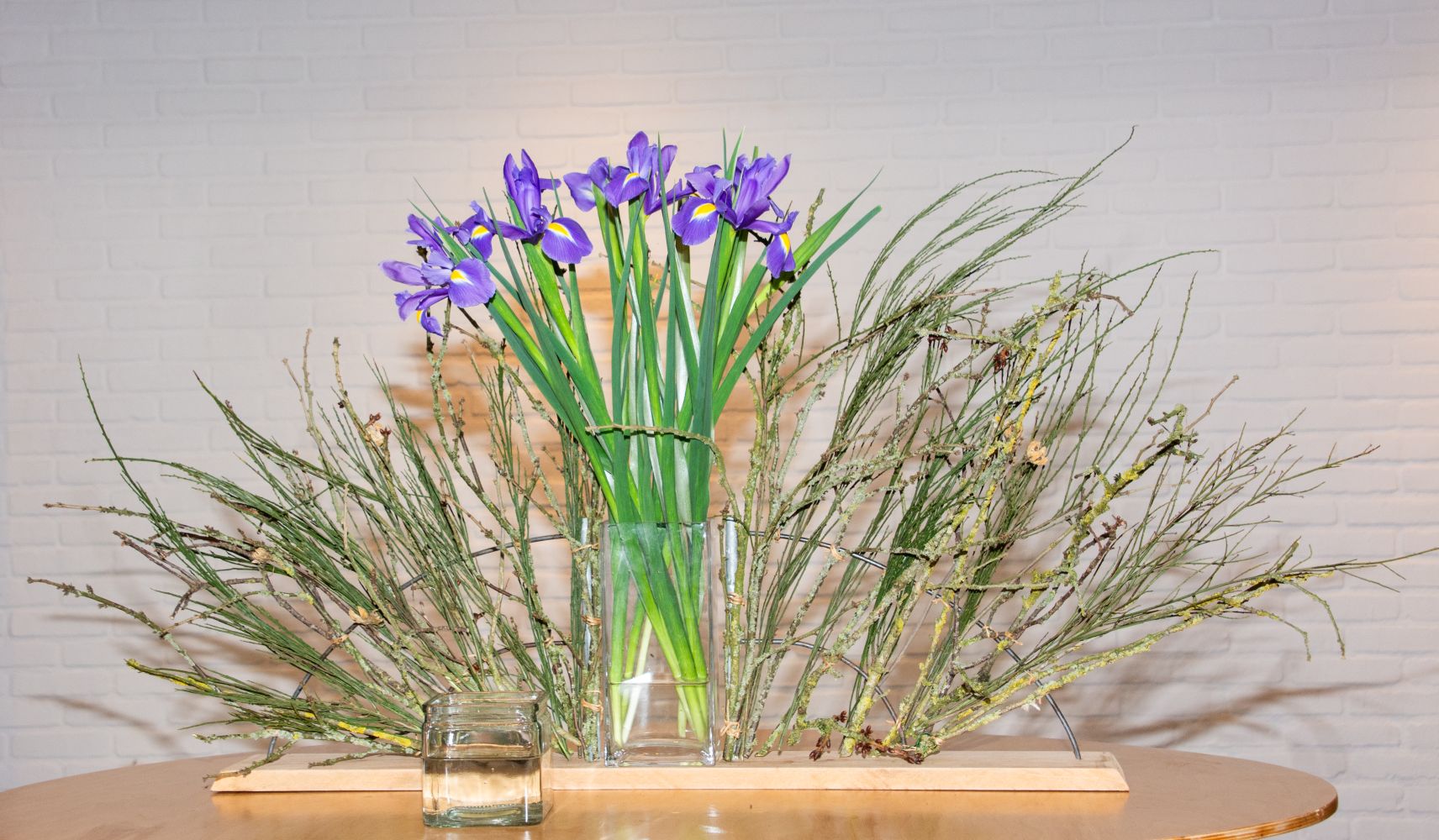 De ontmoeting bij de bron staat centraal in deze schikking. De grote vaas is gevuld met water en irissen en de middelgrote vaas met water als verwijzing naar de bron.