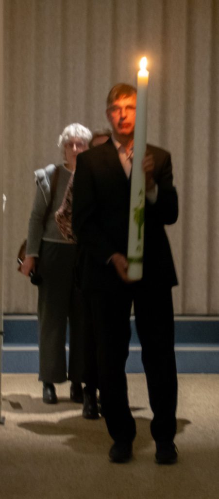 Aan het einde van de dienst ging iedereen met onze brandende kaarsen het duister in.