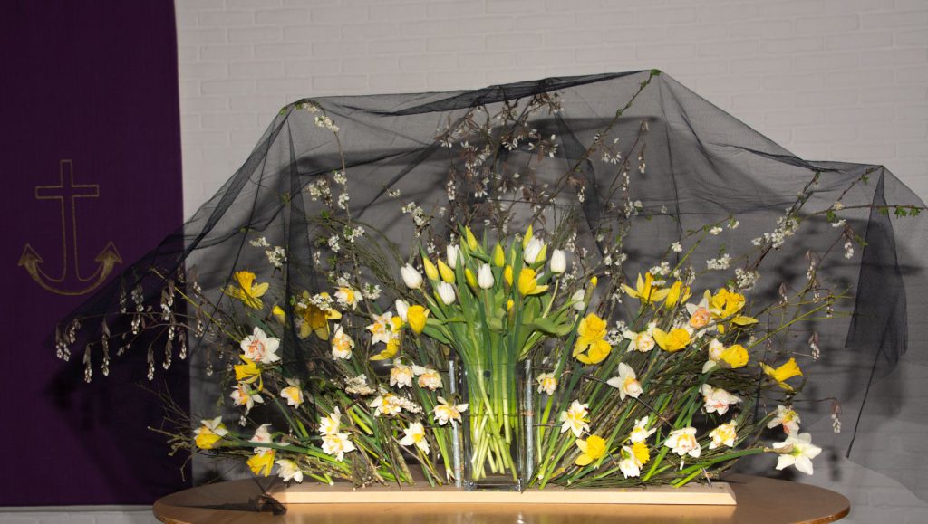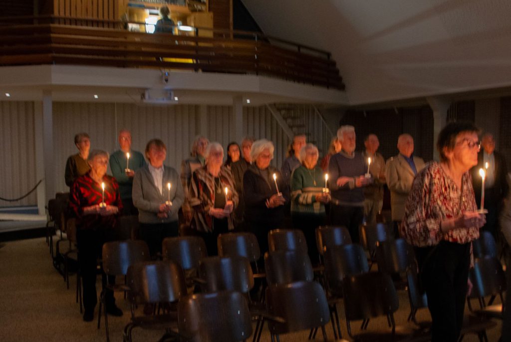 De liturgische kleur veranderde tijdens de dienst van paars naar wit en daarna werd de Maaltijd van de Heer gevierd, op deze bijzondere avond staande in een kring.