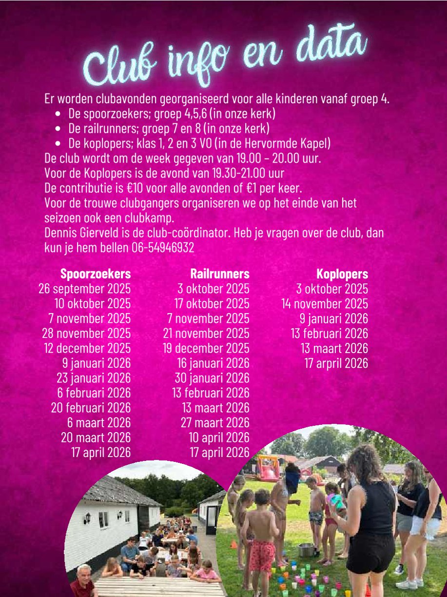 In onderstaand overzicht van de clubavonden kun je zien wanneer er club wordt gehouden. Waar “onze kerk” staat wordt het ontmoetingscentrum van de Gereformeerde Kerk bedoeld.